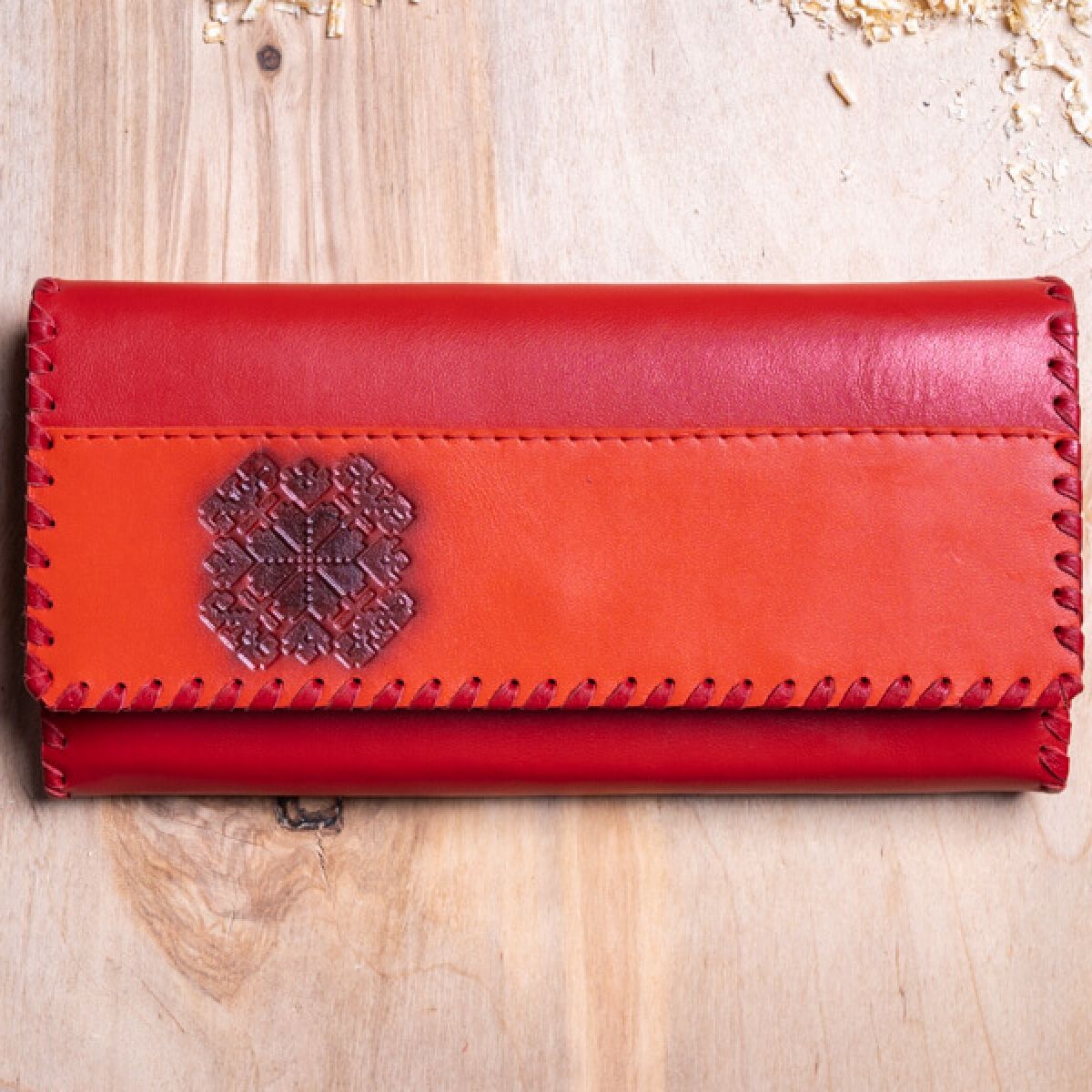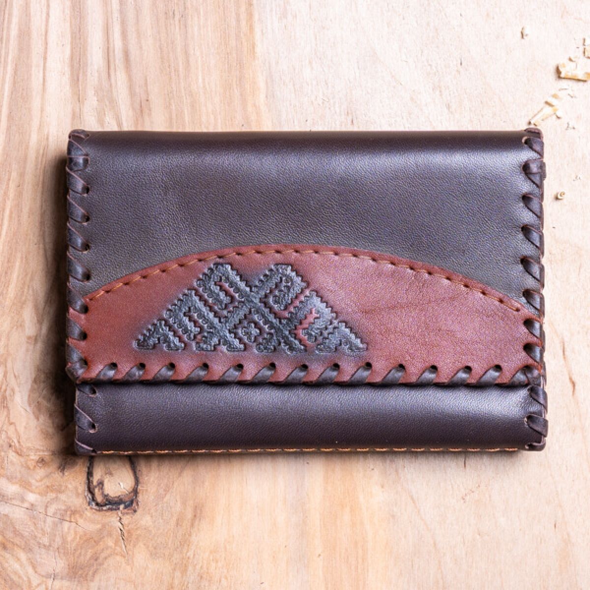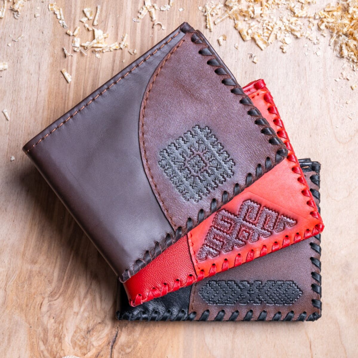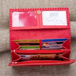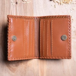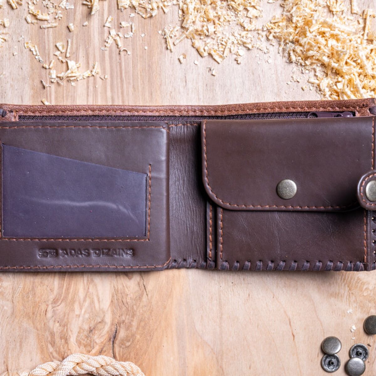Materiāls: dabīga liellopu āda vai aitāda, oderēm izmantota cūkāda, lai uzlabotu maka izturību Izmērs: 12 x 10 cm (aizvērtā veidā), 25 x 10 cm (atvērtā veidā).