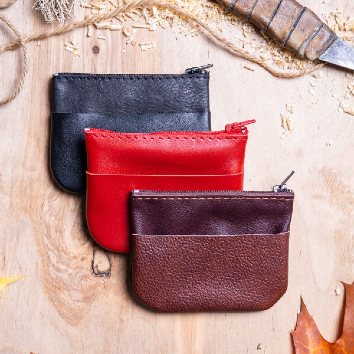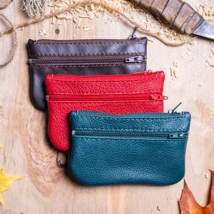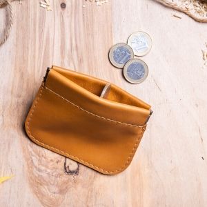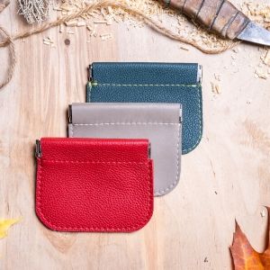 Izgatavots no izturīgas lielopu ādas, izmērs 10 x 8 cm, aizdarē ir metāla atspere, ko atver saspiežot no sāniem.