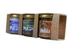 Dāvanu komplekts ar vairākām medus garšām — lieliska iespēja nogaršot dažādus dabīga medus veidus vienā iepakojumā. Komplektā var būt ogu medus (zemenes, dzērvenes, upenes, avenes, mellenes, smiltsērkšķi, krūmcidonijas u.c.), kā arī medus ar ingveru vai ingveru + krūmcidoniju. Katrs medus ir ar savu raksturu — no maigi salda līdz dzīvīgi pikantam.