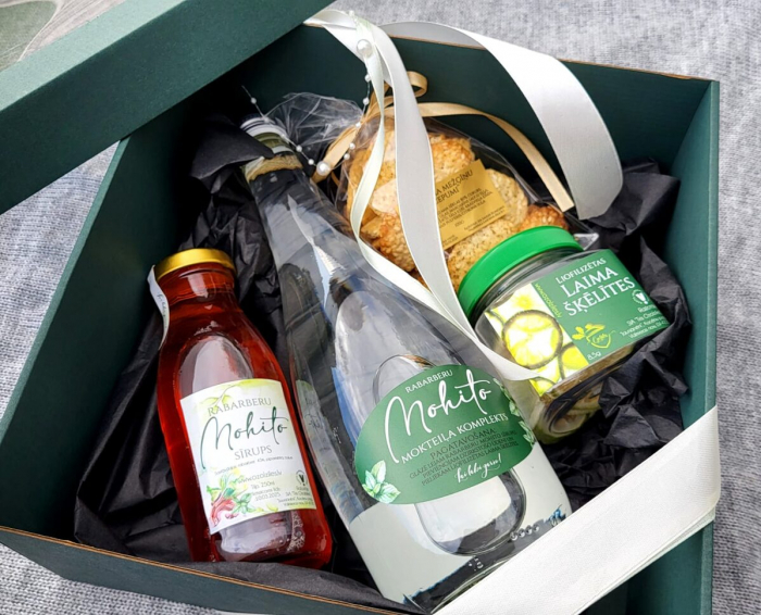 Dāvanu kaste, lai pagatavotu rabarberu mohito mokteiļus divām personām.