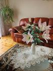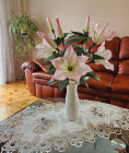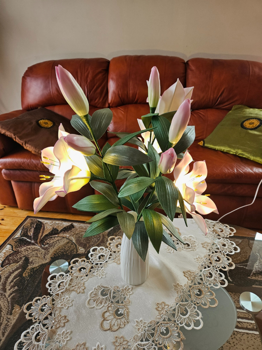 Ar rokām darināta lampa ar trim liliju ziediem un smalkiem pumpuriem, kas telpai piešķir vieglumu, eleganci un izsmalcinātu noskaņu. Lilija simbolizē tīrību un mieru, un tieši tādu sajūtu šī lampa rada interjerā. Iedegta tā izstaro maigu gaismu, kas piepilda telpu ar mājīgumu, bet izslēgta tā saglabā savu dekoratīvo skaistumu un kļūst par elegantu interjera akcentu.Katrs zieds tonēts, veidots ar rūpīgu roku darbu, pievēršot uzmanību detaļām un dabiskām formām.Kompozīcija veidota tā, lai saglabātu vieglumu un līdzsvaru.