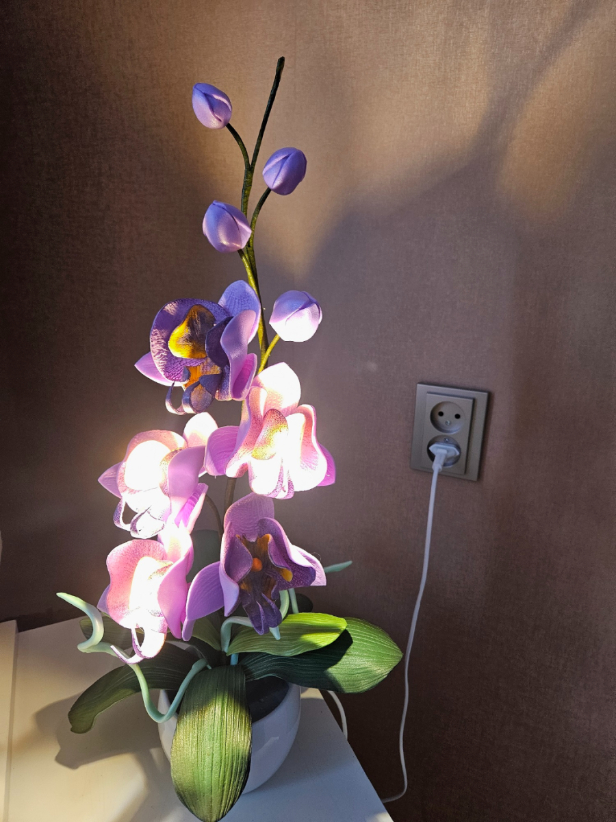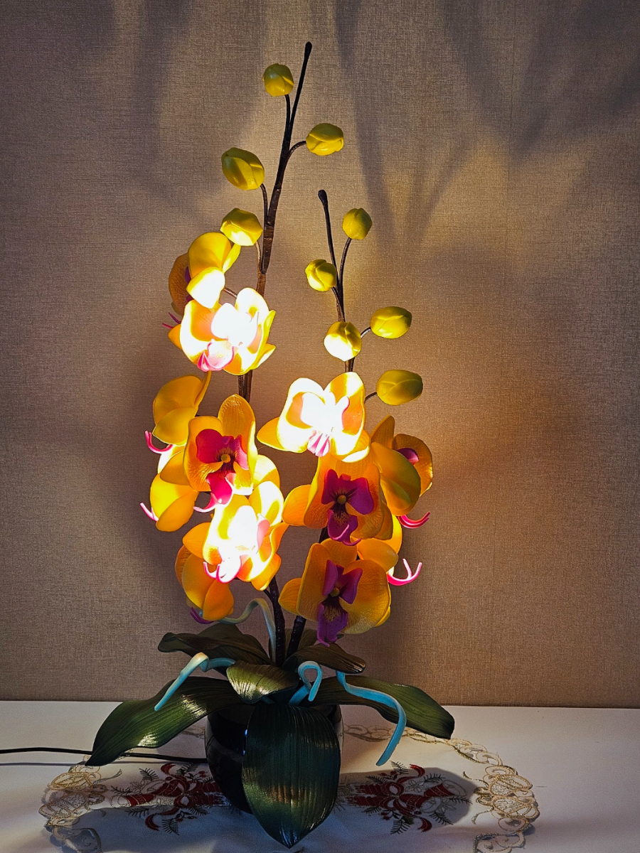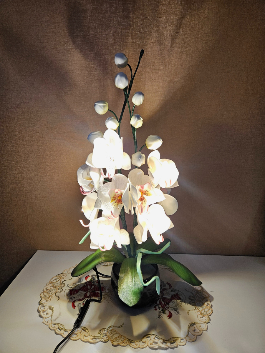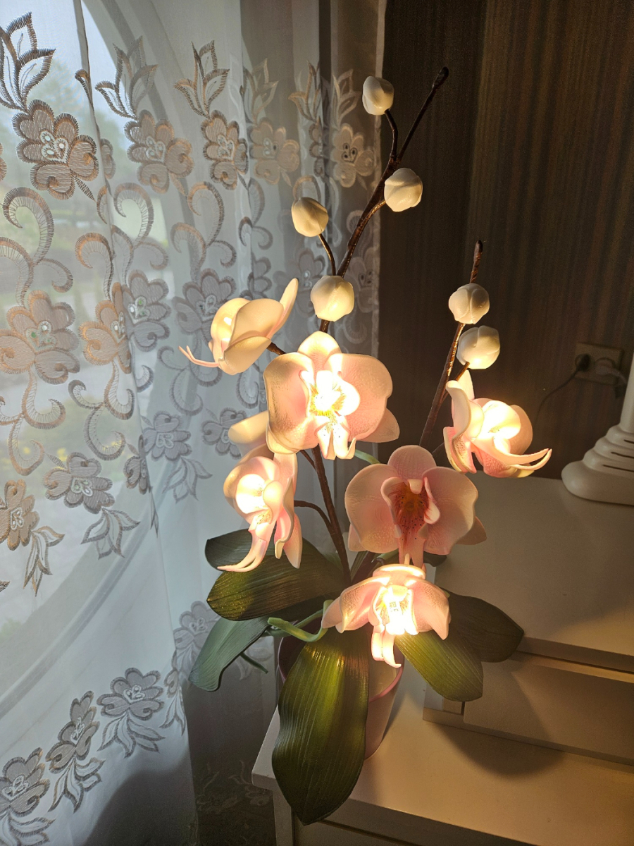 Izsmalcināta roku darba naktslampiņa- orhideja ar pieciem ziediem, no kuriem trīs ir izgaismoti, un pieciem pumpuriem. Lampiņai elegants un gaisīgs siluets, kas piešķir telpai vieglumu un modernu noskaņu. Katra ziedlapiņa veidota ar rokām, rūpīgi modelējot formu un nianses. Lampa rada maigu, siltu apgaismojumu un kalpo kā izteiksmīgs interjera akcents un unikāls dizaina elements tiem, kas novērtē roku darbu un individuālu stilu. Lampiņas augstums ~60 cm.