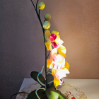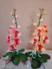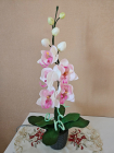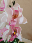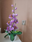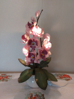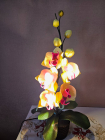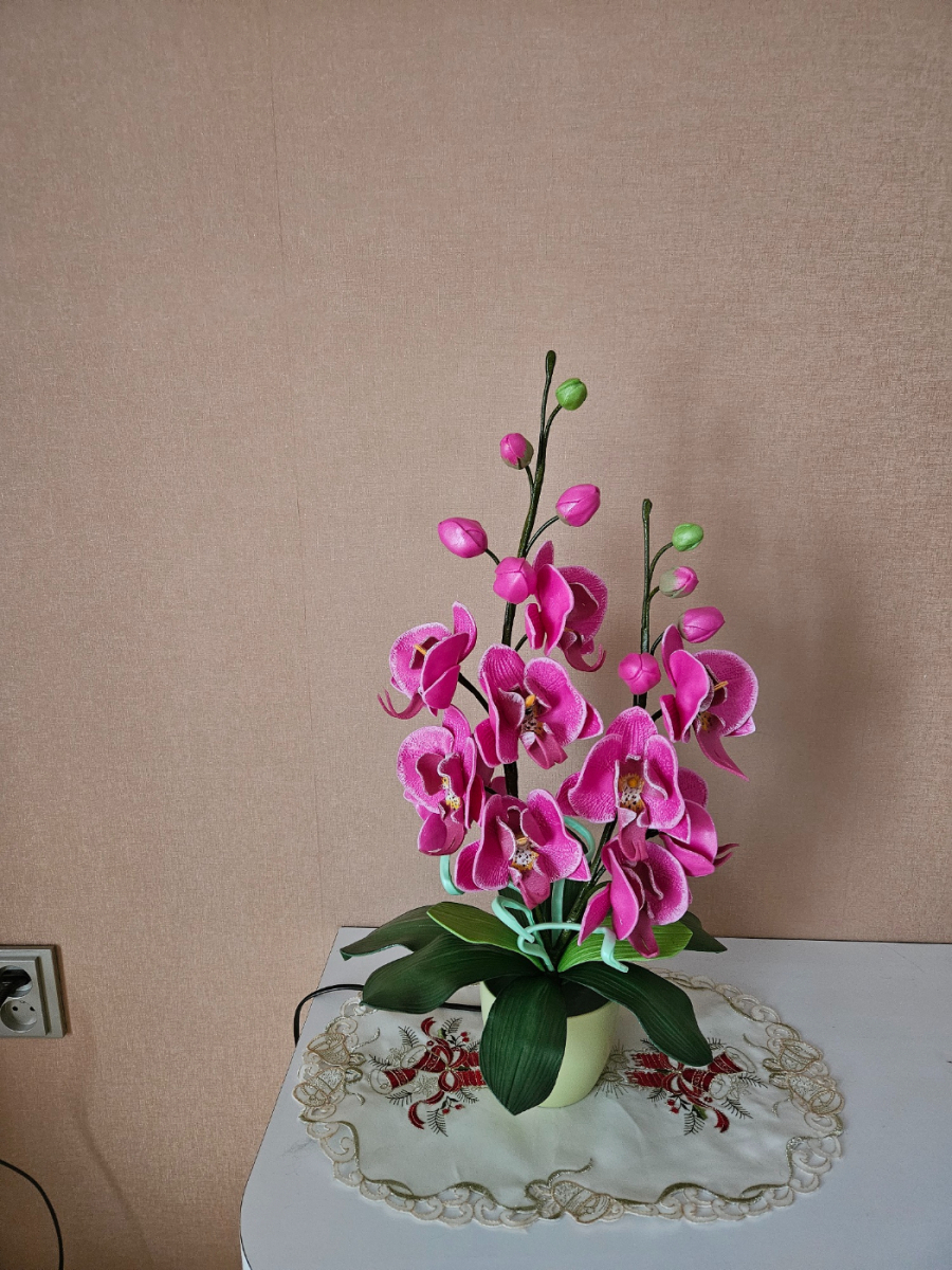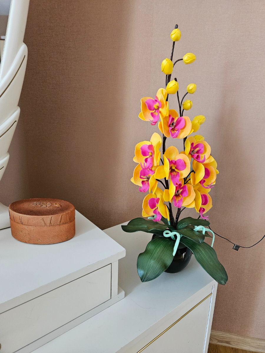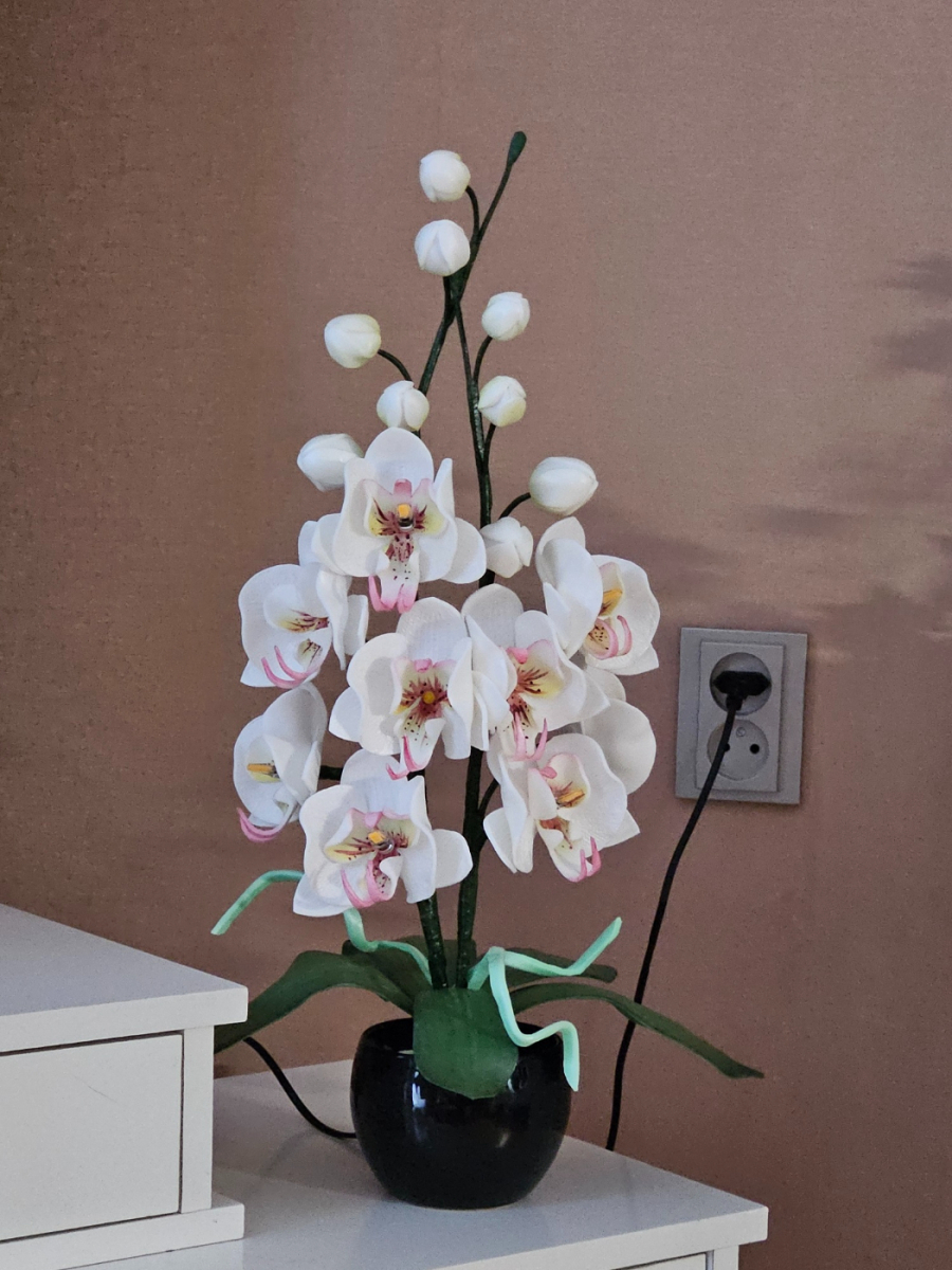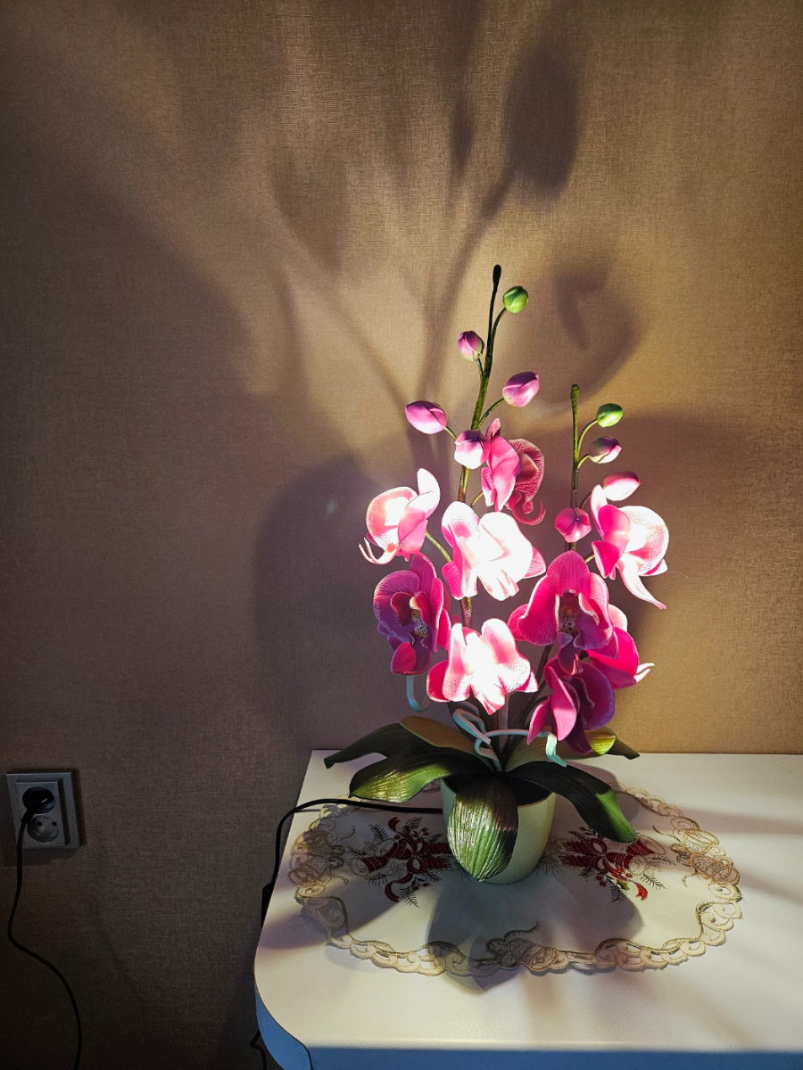Izsmalcināta roku darba naktslampiņa- orhideja ar pieciem ziediem, no kuriem trīs ir izgaismoti, un pieciem pumpuriem. Lampiņai elegants un gaisīgs siluets, kas piešķir telpai vieglumu un modernu noskaņu. Katra ziedlapiņa veidota ar rokām, rūpīgi modelējot formu un nianses. Lampa rada maigu, siltu apgaismojumu un kalpo kā izteiksmīgs interjera akcents un unikāls dizaina elements tiem, kas novērtē roku darbu un individuālu stilu. Lampiņas augstums ~60 cm.