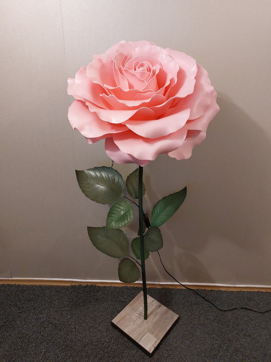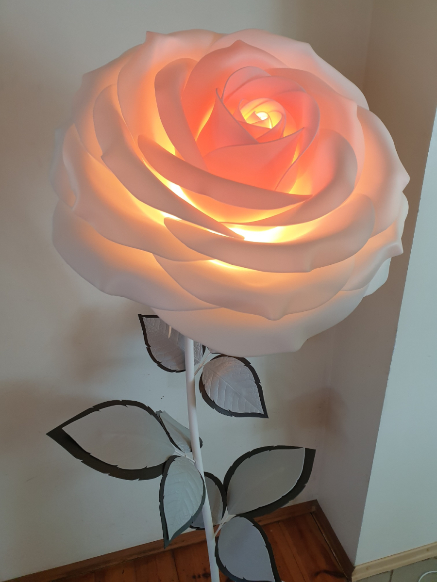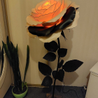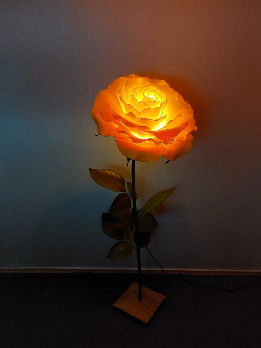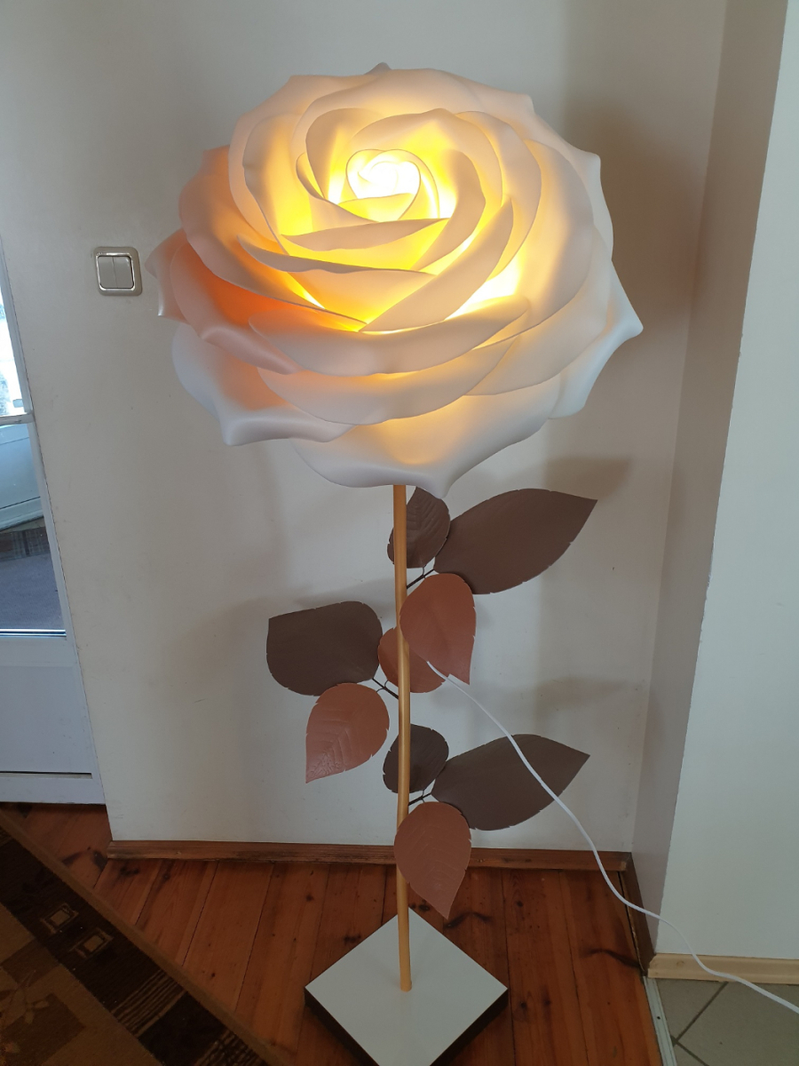 Iespaidīga, skulpturāla roku darba stāvlampa- liela roze ar izteiksmīgu ziedu un elegantu stāju. Šī lampa kalpos ne vien kā apgaismojums, bet arī kā interjera centrālais akcents. Tā izstaro maigu, siltu gaismu un piešķir telpai romantisku un māksliniecisku noskaņu. Lampas augstums ~ 165 cm, zieda diametrs- 60 cm. Piemērota gan modernam, gan klasiskam interjeram- unikāls dizaina objekts, kas piesaista skatienu. Latvijā radīts roku darbs.