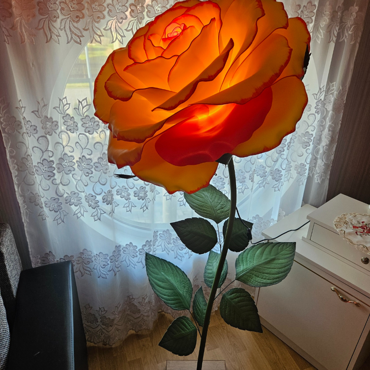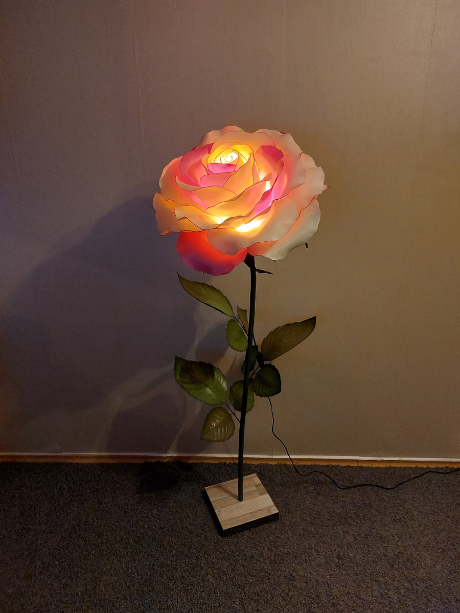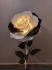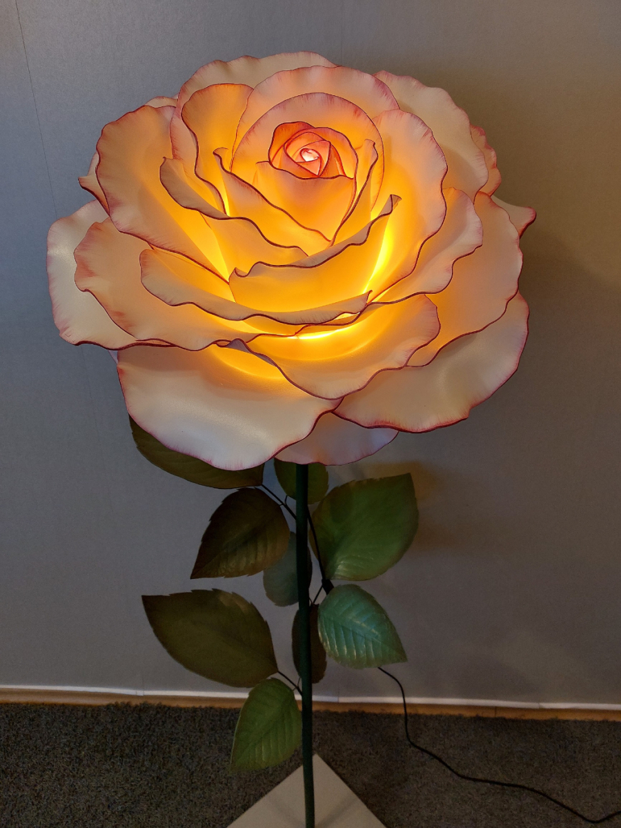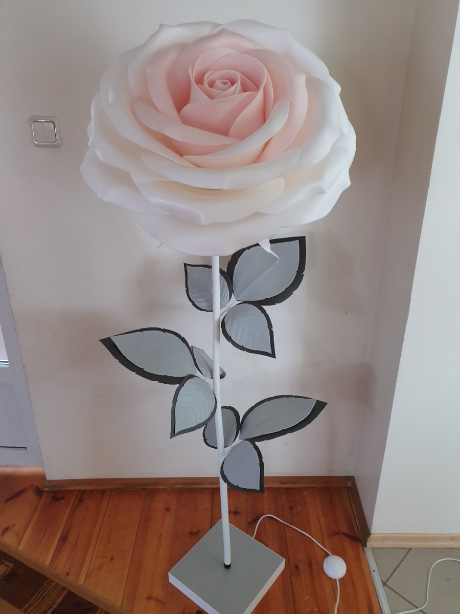 Iespaidīga, skulpturāla roku darba stāvlampa- liela roze ar izteiksmīgu ziedu un elegantu stāju. Šī lampa kalpos ne vien kā apgaismojums, bet arī kā interjera centrālais akcents. Tā izstaro maigu, siltu gaismu un piešķir telpai romantisku un māksliniecisku noskaņu. Lampas augstums ~ 165 cm, zieda diametrs- 60 cm. Piemērota gan modernam, gan klasiskam interjeram- unikāls dizaina objekts, kas piesaista skatienu. Latvijā radīts roku darbs.