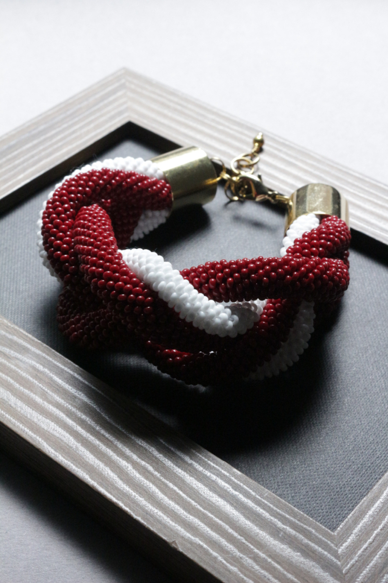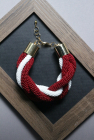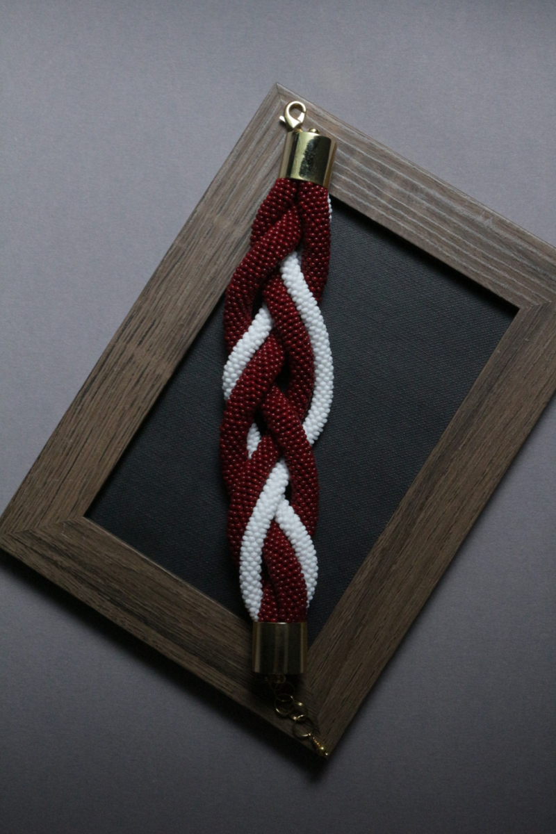 Lielā pītā rokassprādze kas veidota latviešu karoga krāsās