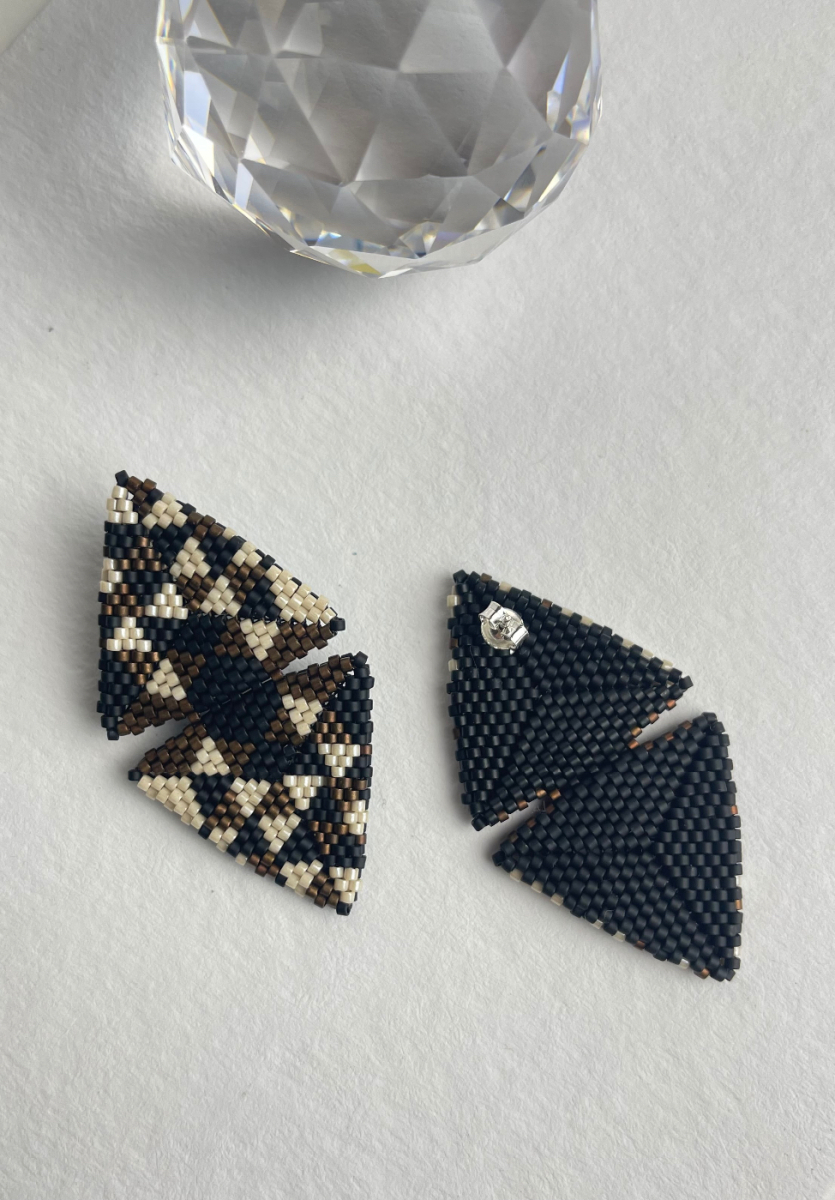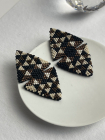 Trīsstūra formas auskari no matētām bronzas, smilškrāsas un melnām matētām sīkpērlēm.